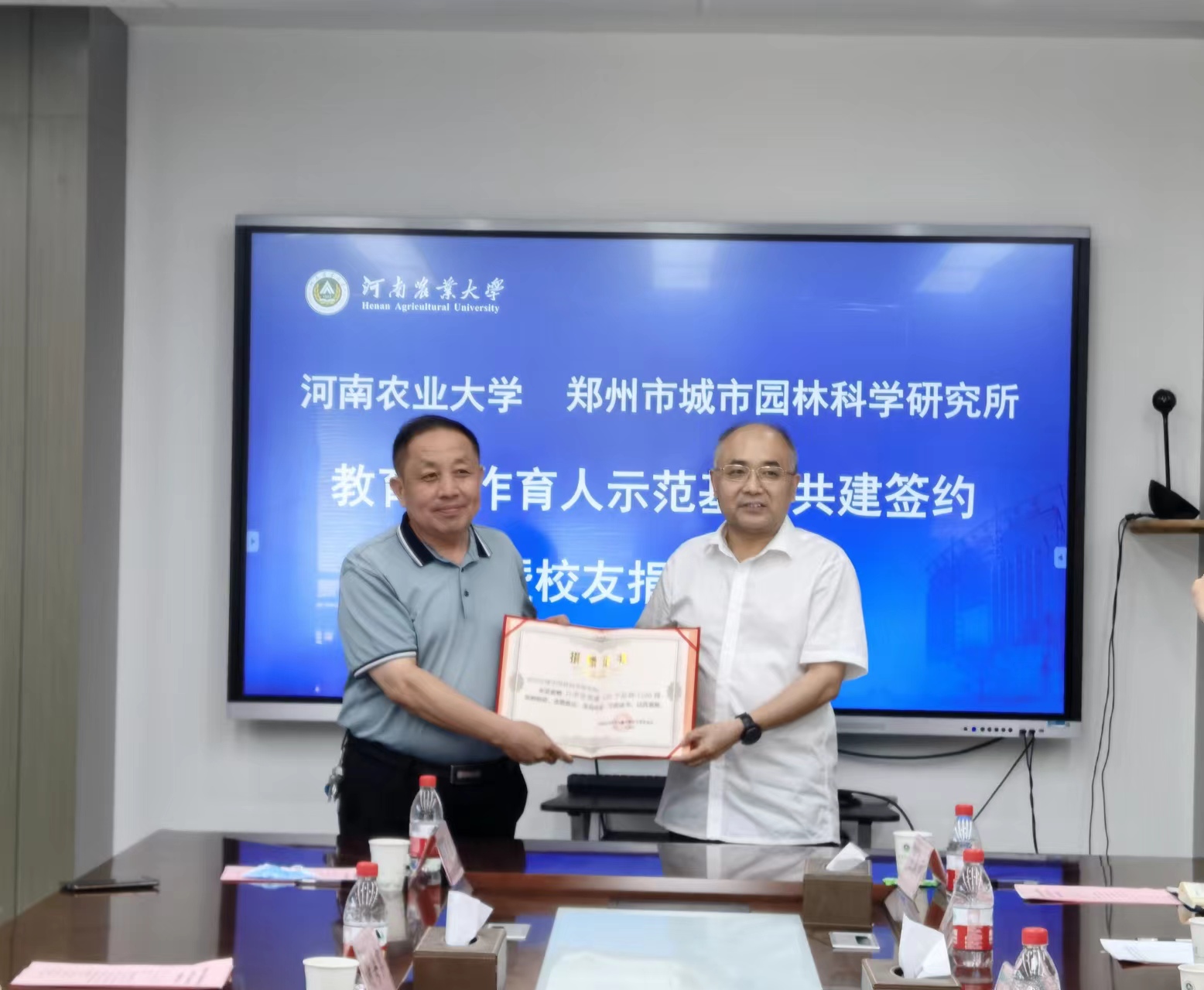 游舸、郭风民代表双方共同为月季资源圃揭牌,签署卓越农林人才教育合作育人示范基地协议。游舸代表学校向郑州市城市园林科学研究所颁发捐赠证书及纪念校徽。