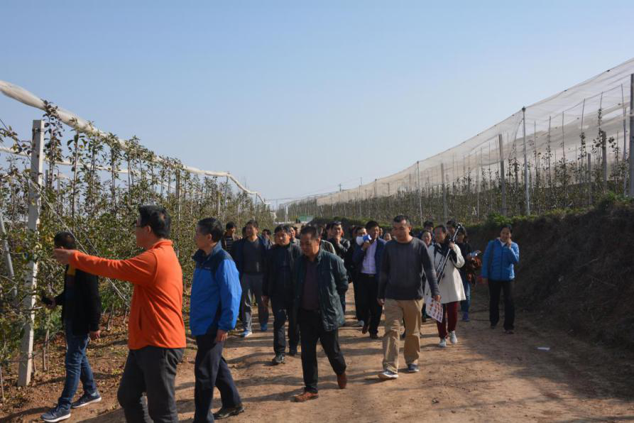 2017年11月7日,河南省重大科技专项果树优异种质创新和高效育种体系现场观摩会在洛宁海升现代苹果矮化密植示范园隆重举行。轻小说 科技处田志强副处长、轻小说 部分教师、河南科技学院部分教师、洛宁海升集团苹果种植技术团队、企业农场主和广大苹果种植大户共计约120余人参加此次观摩会。