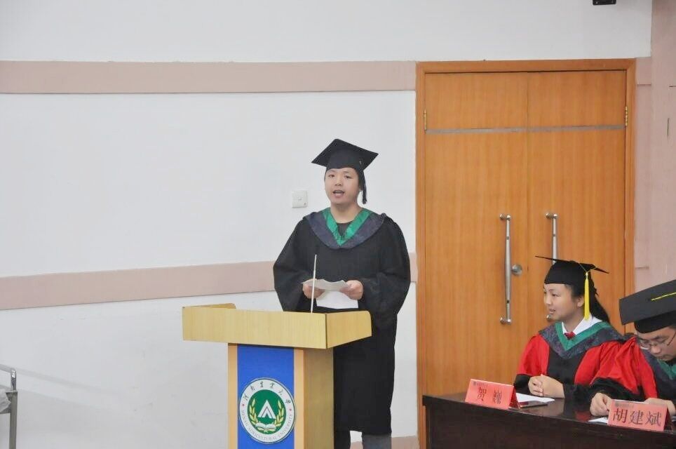 2014级设施农业科学与工程专业学生焦棒棒作为毕业生代表发言,向悉心培育的母校表示最真诚的谢意和祝福,他表示在今后一定牢记恩师们的教诲,牢记院训,用努力和成功回报母校、回报社会。教师代表叶霞副教授发言,为毕业生送去真挚的祝福和嘱托,她对毕业生们提出三点希望,希望同学们要“坚持学习”、“善于思考”、“勤于行动”。