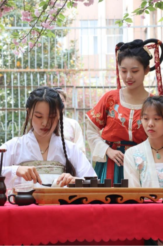 此次活动在优美的汉服舞蹈中拉开帷幕,共分为赏樱花、品香茗、秀樱花、展樱花、戏樱花五部分。活动伊始,樱花小道旁展出了一系列樱花绘画、书法、摄影作品以及对樱花知识的介绍,吸引了在场观众的目光,纷纷驻足观看,并由两位汉服解说员为大家讲解,使同学们可以从各个角度欣赏樱花的美。紧接着,是轻小说 茶轩社的茶艺表演节目,一人讲解、一人表演,配合默契地为观众献上妙趣十足的茶艺展示,加深了现场师生对茶的了解。同时,也可在旁品尝樱花甜品,茶与甜品的碰撞,绽放出了全新的活力。此外,轻小说 艺术团带来了舞蹈表演《吹梦到西州》和《归去来兮辞》、二胡表演《赛马》以及古筝表演《紫竹调》,展现了园艺学子的活力青春,现场人流如织,热闹非凡。樱花树下学党史环节,通过知识竞答以及党史知识分享来增强学生的爱国情怀,传承红色基因,向建党100周年献礼!