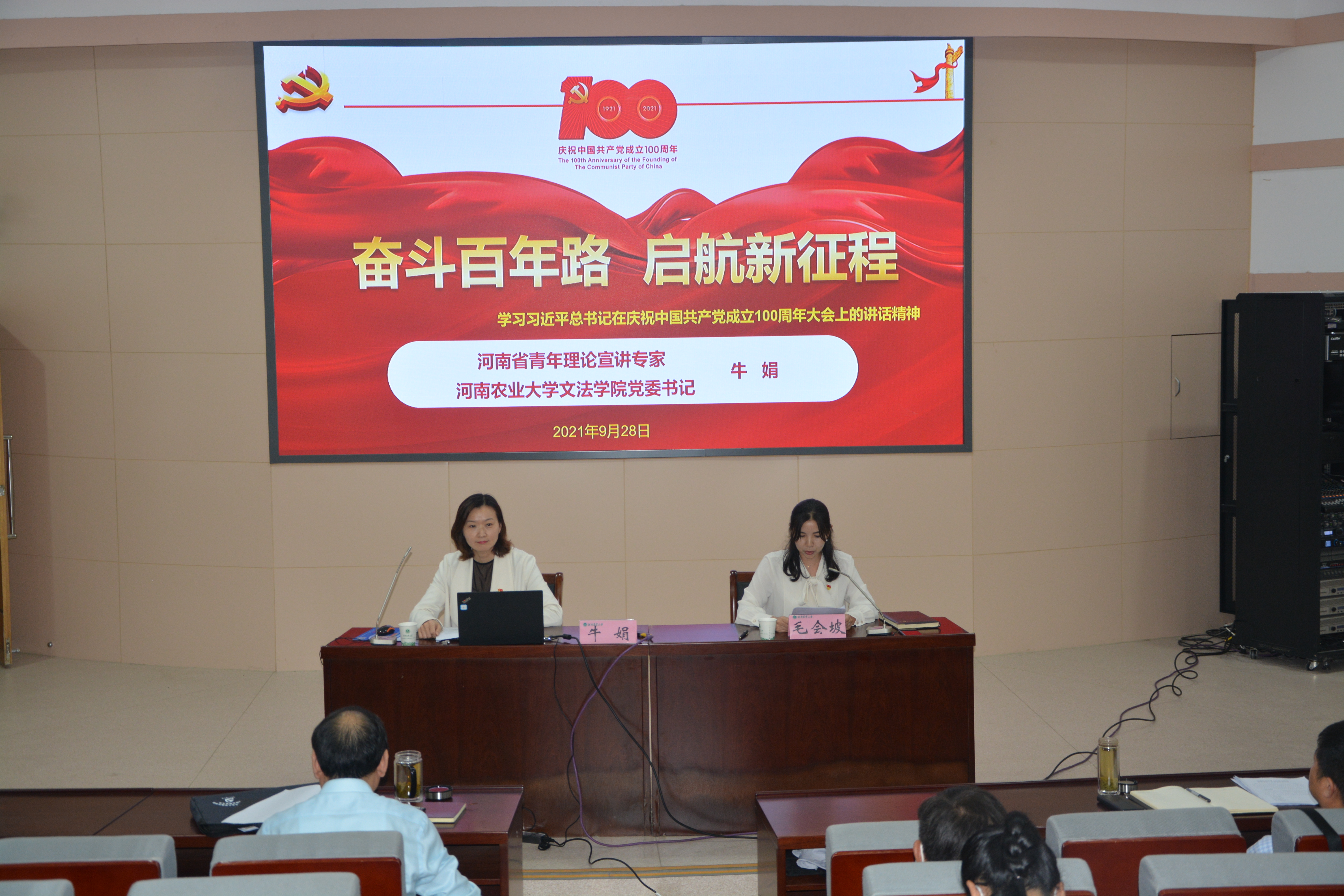 牛娟书记以《奋斗百年路,启航新征程》为题,从政治维度、理论维度、历史维度、情感维度等方面对习近平总书记“七一”重要讲话的精神内涵进行解读。从“一个主题”、“九个必须”、“两个一百年奋斗目标”、“一个伟大建党精神”、“四个伟大成就”“四个庄严宣告”等六个方面,对习近平总书记“七一”重要讲话内容进行了全面细致的讲解。