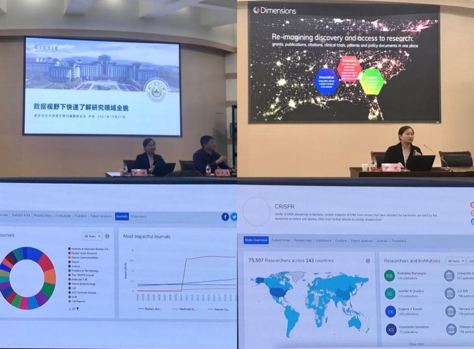 报告会上,尹欢博士重点介绍了3个快速获取研究领域全貌的搜索引擎,分别为wizdom.ai、Dimensions、Jane,并以“CRISPR”作为关键词举例,从如何了解研究领域的主要内容、如何获取最新的研究进展、如何选择投稿的期刊、如何选择审稿人这四个方面作了详细的阐述。尹欢博士还通过形象生动的图表介绍了搜索引擎中的Researchers and Institutions、Funding、Publication Activity、Top Publishers、Top Institutes、Most Recent Publications等主要信息,为科研工作者提供了很好的获取信息资源的软件和方法。