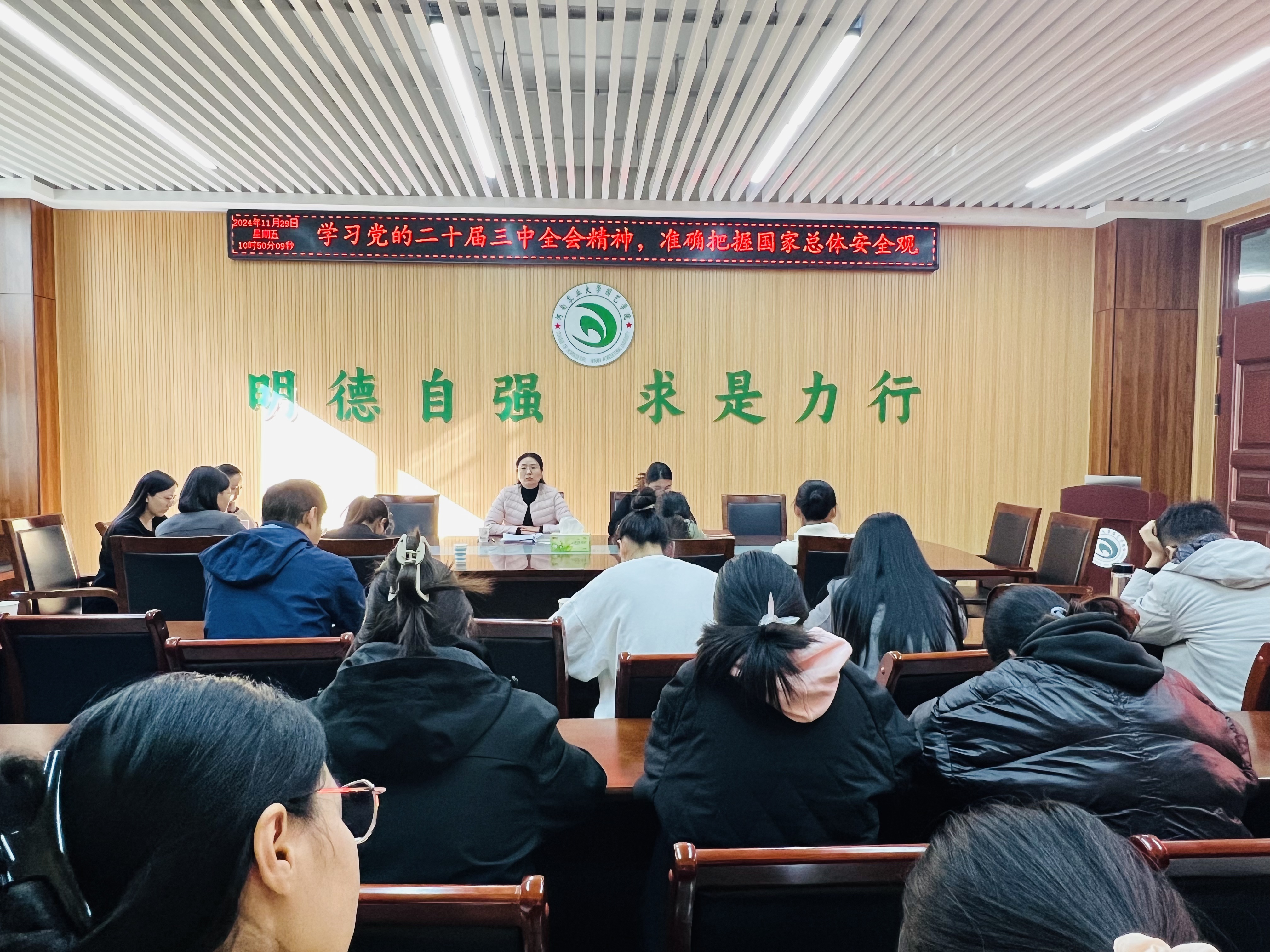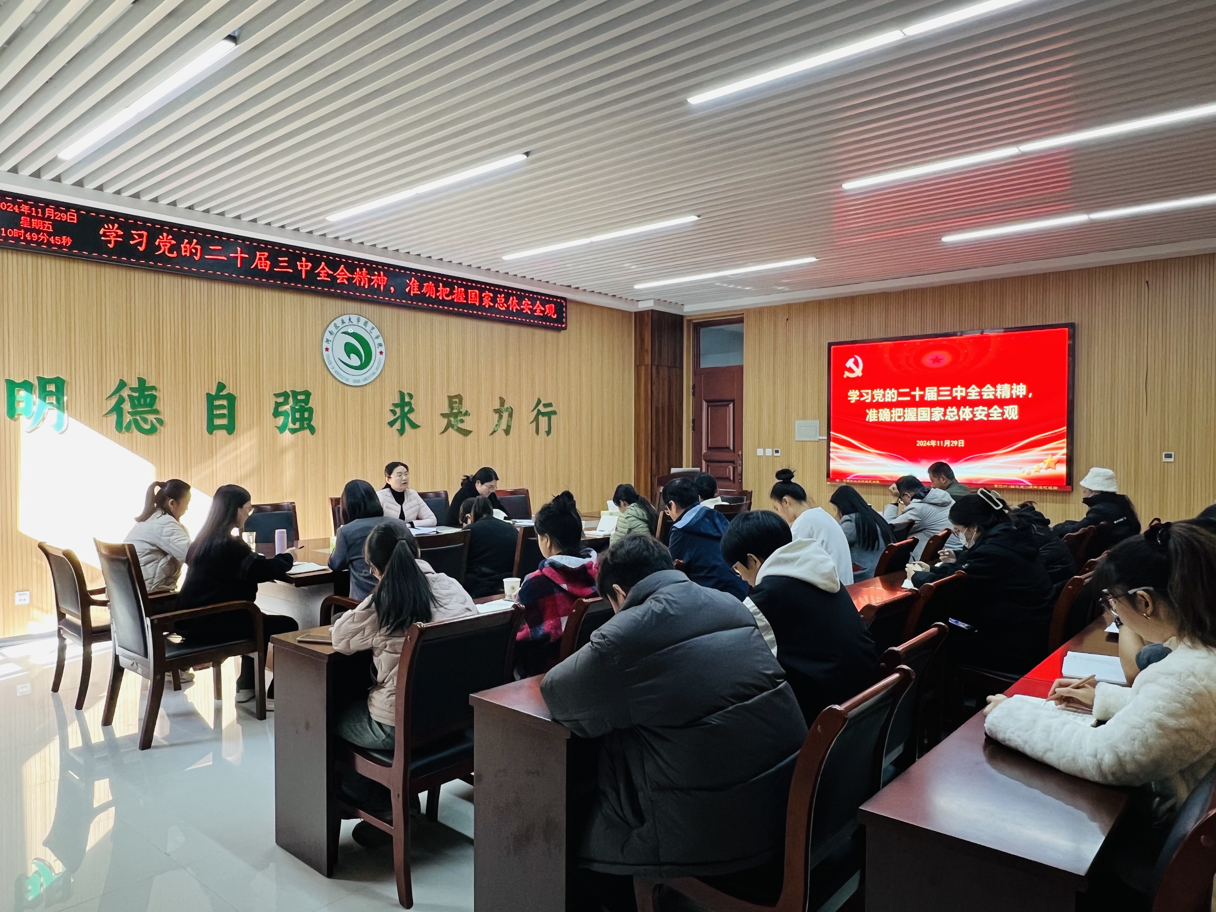 11月29日,学院在龙子湖校区力行楼北215会议室召开学习党的二十届三中全会精神,准确把握国家总体安全观专题报告暨党务工作培训会。学院党委书记秦素玲主持会议并作专题报告。学院党委副书记余果、学院教工党支部及学生党支部全体委员参加会议。