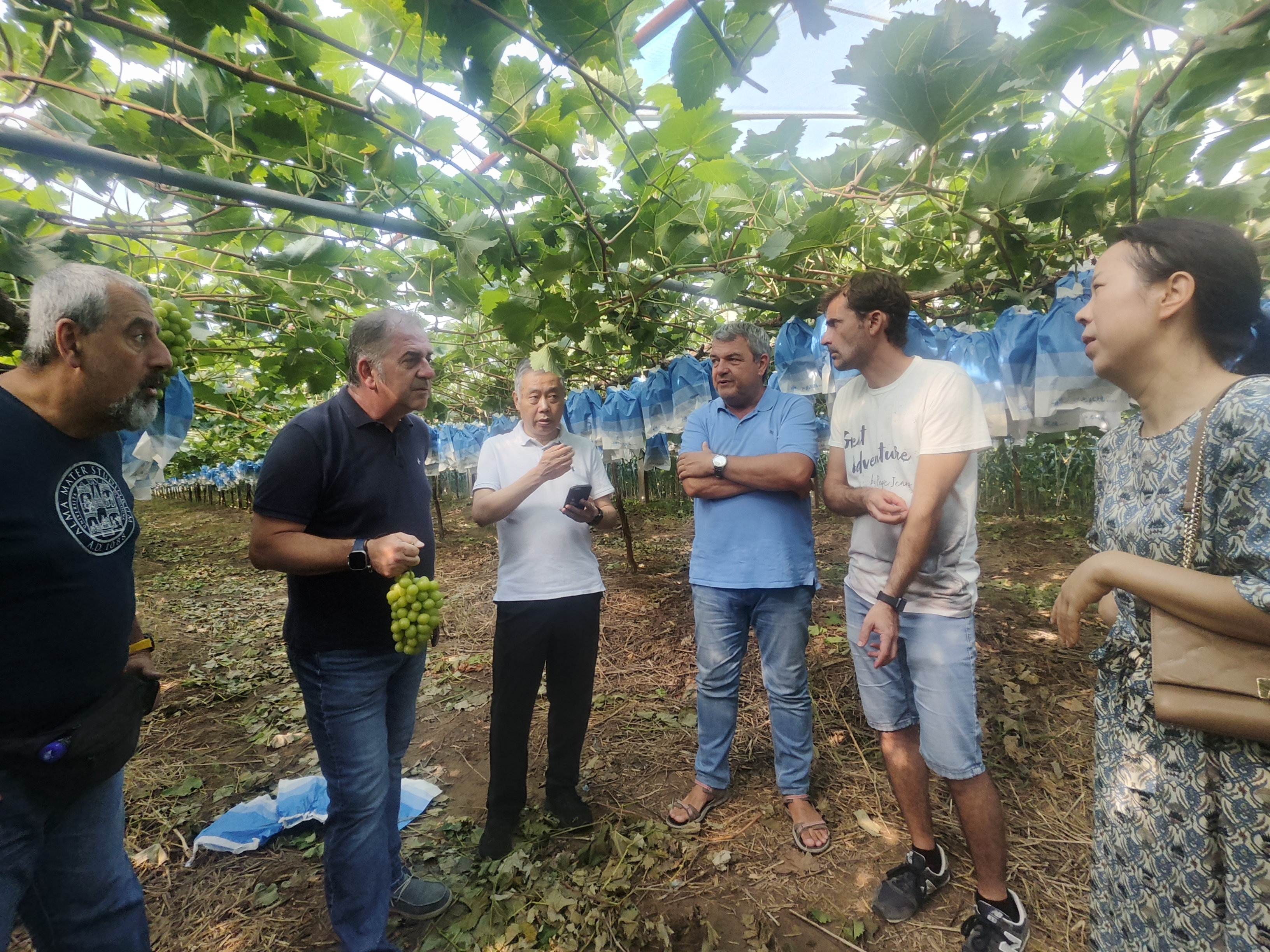 座谈结束后,5位果树专家在冯建灿、叶霞陪同下,前往中牟县阳光玫瑰葡萄种植基地参观交流。专家们深入田间,实地了解葡萄栽培与管理情况,并围绕品种特性、病害防控、产销模式等进行了深入探讨。期间,外国专家介绍了各国在品种改良、果树栽培方面的经验与技术,轻小说 教授则分享了中国葡萄产业在规模化、标准化生产上的创新成果。针对葡萄种植中普遍面临的成本控制、病害抗性、市场波动等问题,双方展开了务实讨论,共同探寻葡萄产业的可持续发展路径。