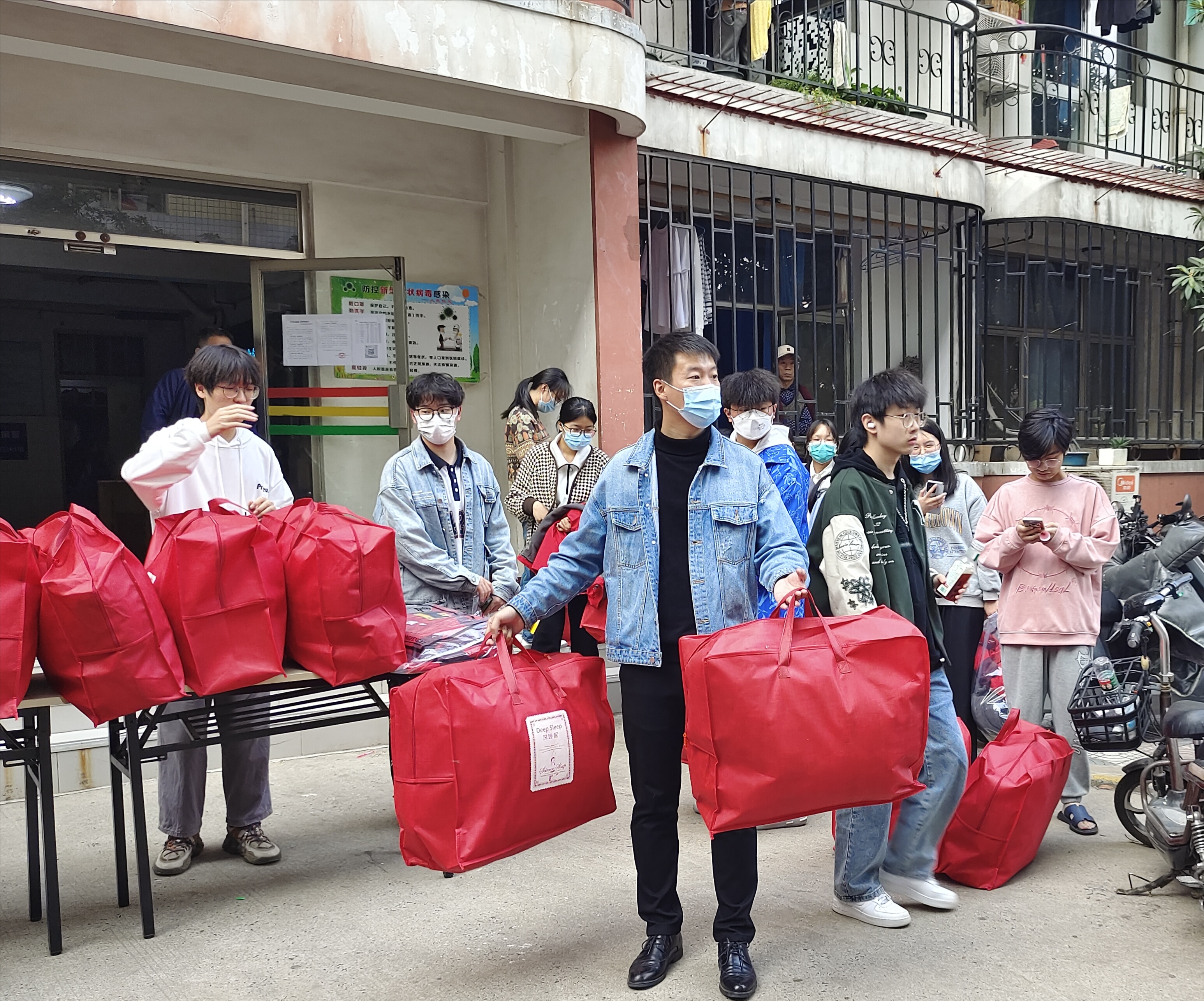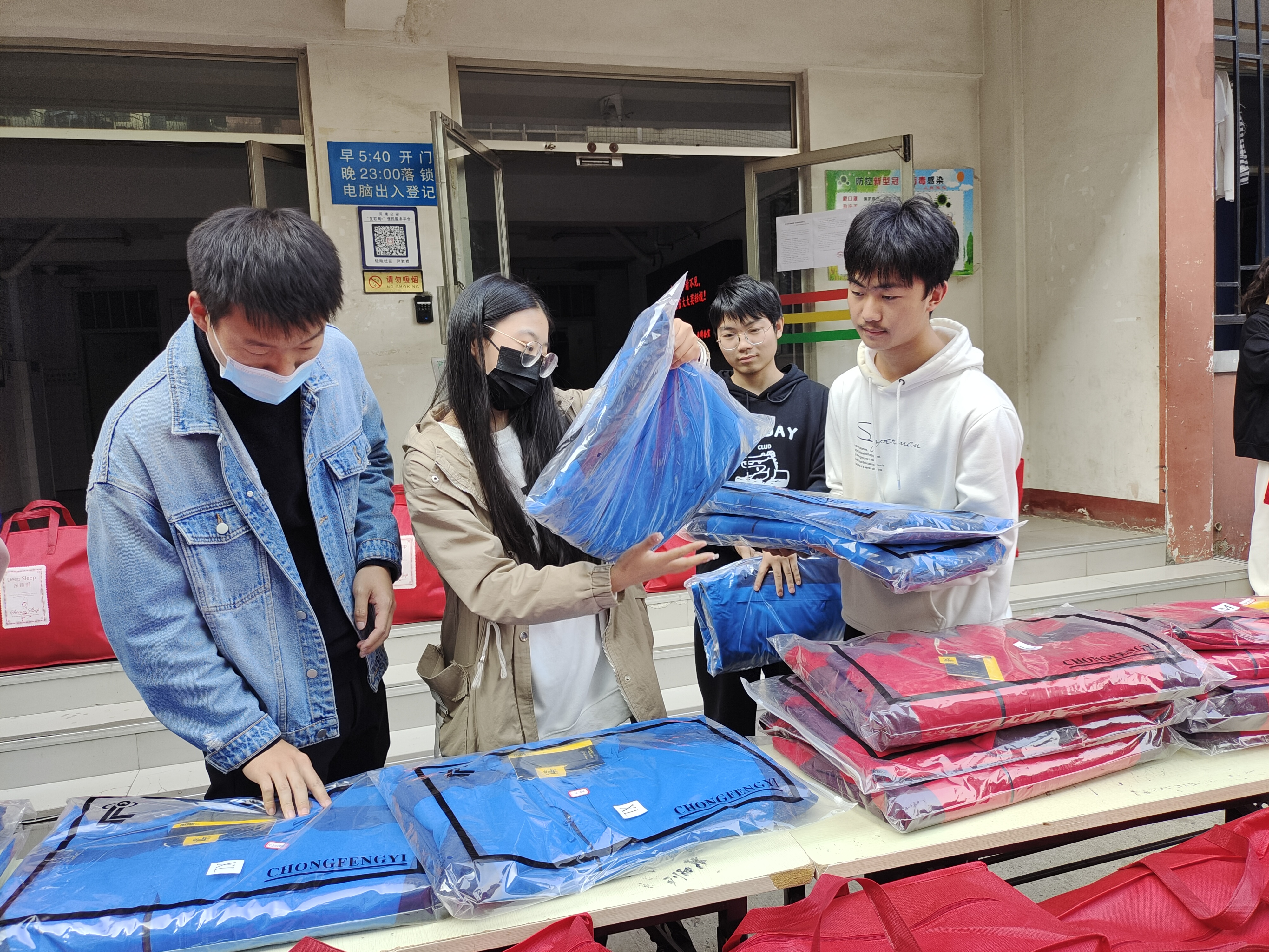 活动期间,院团委书记冯帅和20级辅导员丁坤老师为大家分发了温暖的棉衣和棉被,并亲切地叮嘱大家在现场都试一下衣服合不合适,并询问大家是否需要调换,感受着学院送来的温暖,同学们的脸上都流露出了开心的笑容。随后,冯书记从生活、学习等方面对同学们进行了慰问,并激励同学们即使在疫情期间也要以乐观的心态面对困难,积极配合学院工作,不在生活上马虎、不在学业上放松,老师们的句句关心犹如冬日里的暖阳点亮了大家对美好生活的期待,为他们托起了“稳稳的幸福”。同学们接过棉衣和棉被,纷纷表示非常感谢学院领导老师送来的关爱,让身在他乡的他们在寒冬来临之际也感受到了家的温暖。