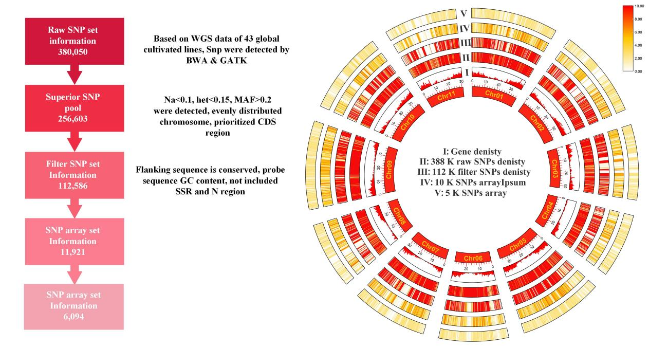 (1)通过将来自不同地区43份代表性西瓜种质的重测序数据,比对到西瓜参考基因组,经过筛选和过滤,获得了122K可用于液相芯片检测的SNP位点。基于这些位点,以均匀分布西瓜11条染色体的原则,选择不同密度(5K和10K)的SNP并结合GTBS技术开发了两款西瓜液相芯片,为西瓜不同应用场景的使用提供了灵活选择。此外,两款芯片整合了目前报道的西瓜功能位点,使其具备前景选择的能力,能够在育种过程中高效筛选优异基因型。