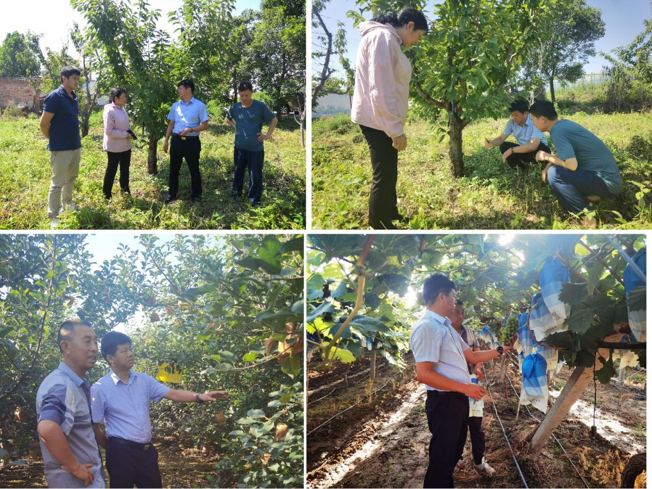 8月1日,郑先波一行第一站来到了洛阳市昊奇农业园,针对基地樱桃树流胶病和卷叶现象严重等问题现场把脉问诊,通过勘察基地地势地形、流胶状态和卷叶情况,指出流胶病和卷叶严重是由于园区基地地势低洼,加之今年雨水多,不能及时将水排出、积水过多导致。建议及时沿树行挖排水沟、通过起垄栽培的方式改善流胶病和卷叶现象。同时,建议基地在9月到11月之间增施有机肥,改良土壤结构和增强土壤通透性,冬季主干和大枝要涂白,防止冻害和日灼。随后郑先波一行又来到了三门峡市陕州区二仙坡葡萄和苹果种植基地,通过生产基地实地考察,指出了苹果生产基地存在种植密度过大而导致果园通风透光不良的现象,而且背上枝过多,需要逐步对果园改造,并指出这也是三门峡市果园普遍的现象,进行果园改造升级、提质增效是三门峡市果园改造的重点工作;随后在葡萄生产基地中发现部分叶片已开始出现霜霉病,需要及时清除染病的叶片,而且最近雨量过大,果实膨大加速,要注意增施“钙”肥预防水罐子病。