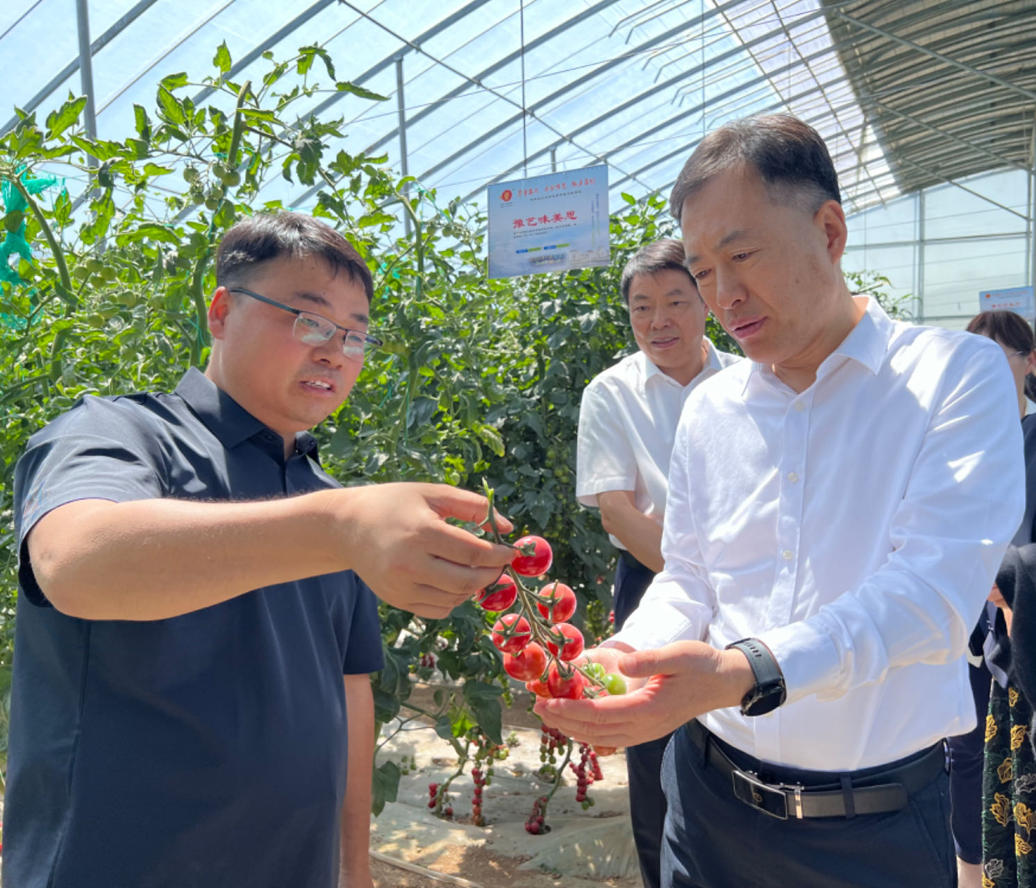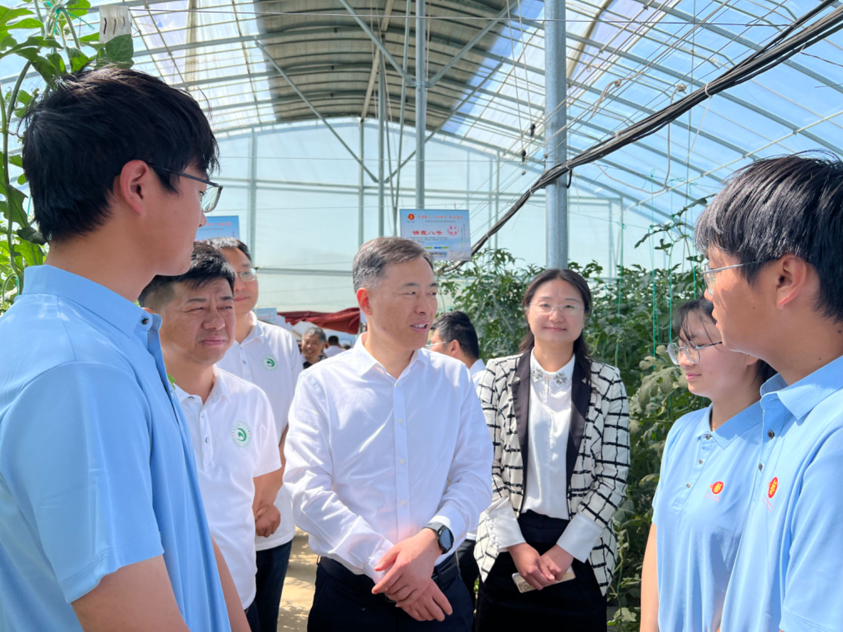 随后,一行人一同观看网红直播带货,参观河马仙果小镇西红柿、辣椒、西瓜展示大棚。期间,李成伟看望了在河马仙果小镇实习的园艺学生,勉励园艺学子要脚踏实地,立足专业优势,把双脚扎进泥土里,把论文写在田地上,为全面实现乡村振兴注入更多的青春力量。