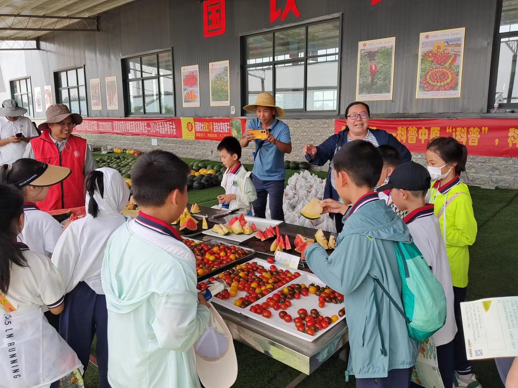 活动期间,老师们一方面协助带领小农宝们排队进棚,另一方面向小农宝们展示现代农业科技以及西瓜、甜瓜、南瓜和番茄等蔬菜科技种植成果,并带领小农宝们一起品尝优质西瓜和番茄。附中教工第三党支部书记孟江涛代表支部表达了对蔬菜系教工党支部的欢迎和感谢。