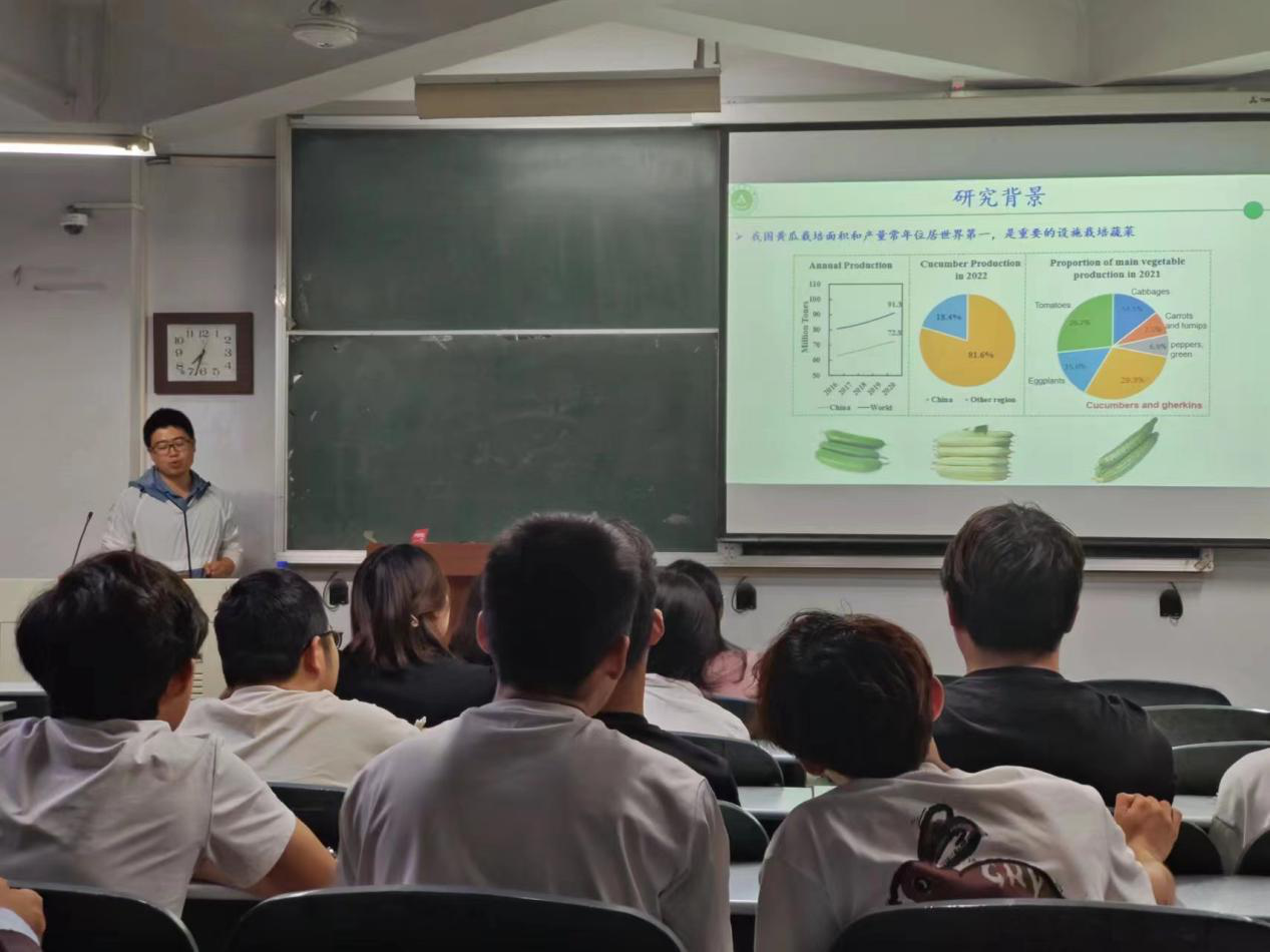 杨森教授首先从黄瓜的起源与传播,到我国黄瓜的栽培面积和产量,再到我国黄瓜产业规模的转变,详细地向同学们讲述了黄瓜作物的研究背景;其次又向同学们展示并讲解了黄瓜果刺发育时期的划分,以及通过正向、反向遗传学手段挖掘黄瓜果刺发育相关基因的实验思路和技术路线,让同学们对黄瓜相关的研究有了初步的了解。此外,杨森教授还从黄瓜小果刺方面向同学们介绍CsSBS1基因的图位克隆、CsSBS1基因编辑导致果刺基座变小,同时给出黄瓜果刺基座大小性状可能受到人工选择的结论。