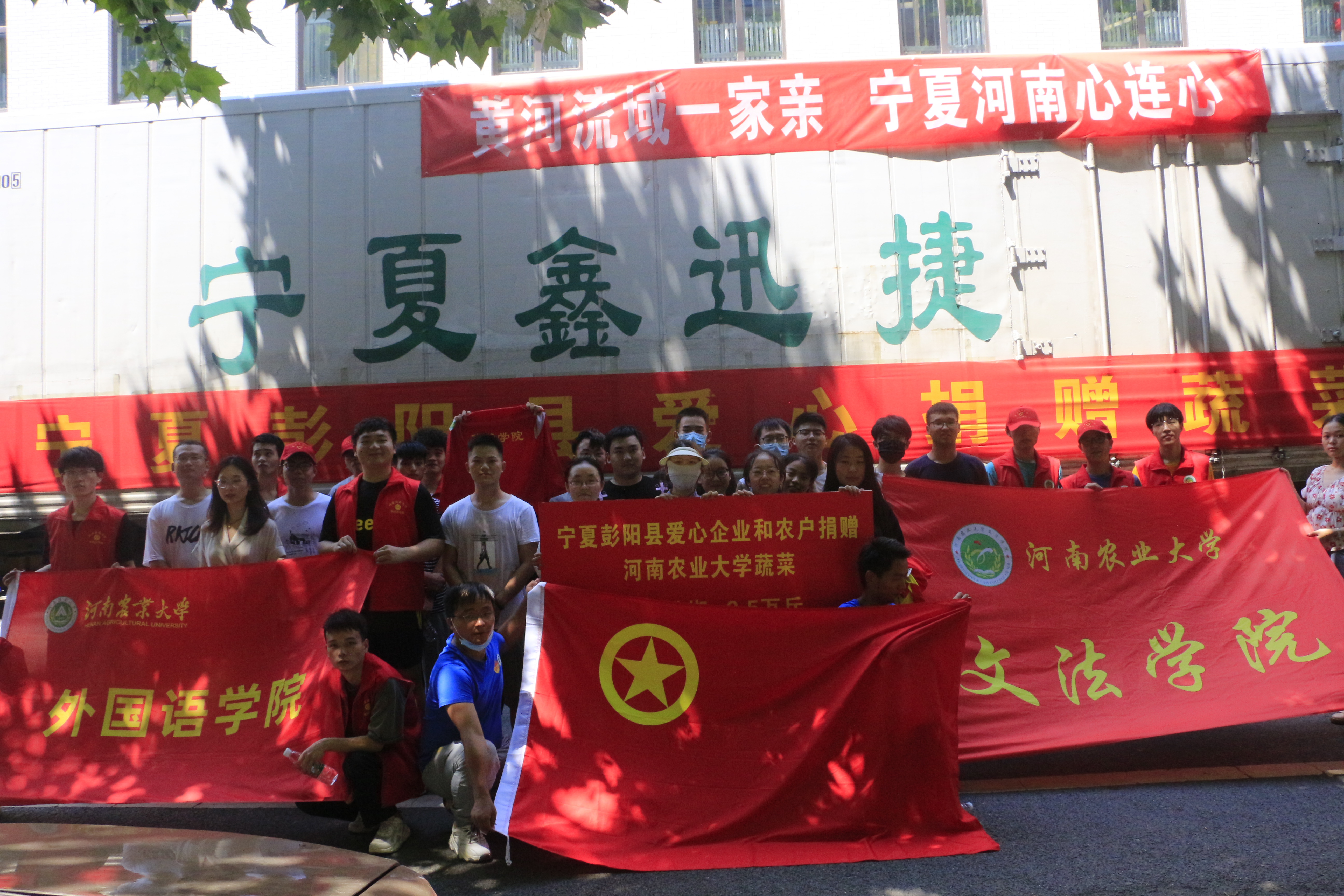 宁夏彭阳县农业农村局高级农艺师惠浩剑,彭阳县红河镇常沟村党支部书记王爱彬等一行4人,带着宁夏人民对河南人民的深情厚谊,经过连夜驱车奔波,将宁夏爱心企业和彭阳县农户捐赠的满满一卡车蔬菜运送到我校。校团委组织青年突击队、青年志愿者服务队经过三个多小时的紧张工作,终于将全部蔬菜卸货到指定地点。洪水无情,人间有爱,在学校防汛救灾的紧要关头,宁夏人民千里送菜,给予了全校师生战胜困难的坚定信心。(撰文/冯帅 审核/毛会坡 发布/冯瀚瀚)