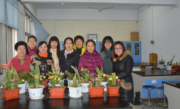 首先,学院中心实验室主任张惠梅详细介绍了盆景原材料种类、生长特性以及组合的原则等。接着女教师们展开丰富的想象,开始动手组合盆景,五颜六色的长寿花、娇羞可爱的石竹、亭亭玉立的袖珍椰子以及金妞、万重山、观音莲等各种不同种类的花卉,在她们的巧手中,透过不同的花艺方式呈现,不一会儿就呈现出一盆盆花枝招展的创意盆栽。整个活动充满了欢声笑语。最后,大家将各自的作品一一展示并合影留念。