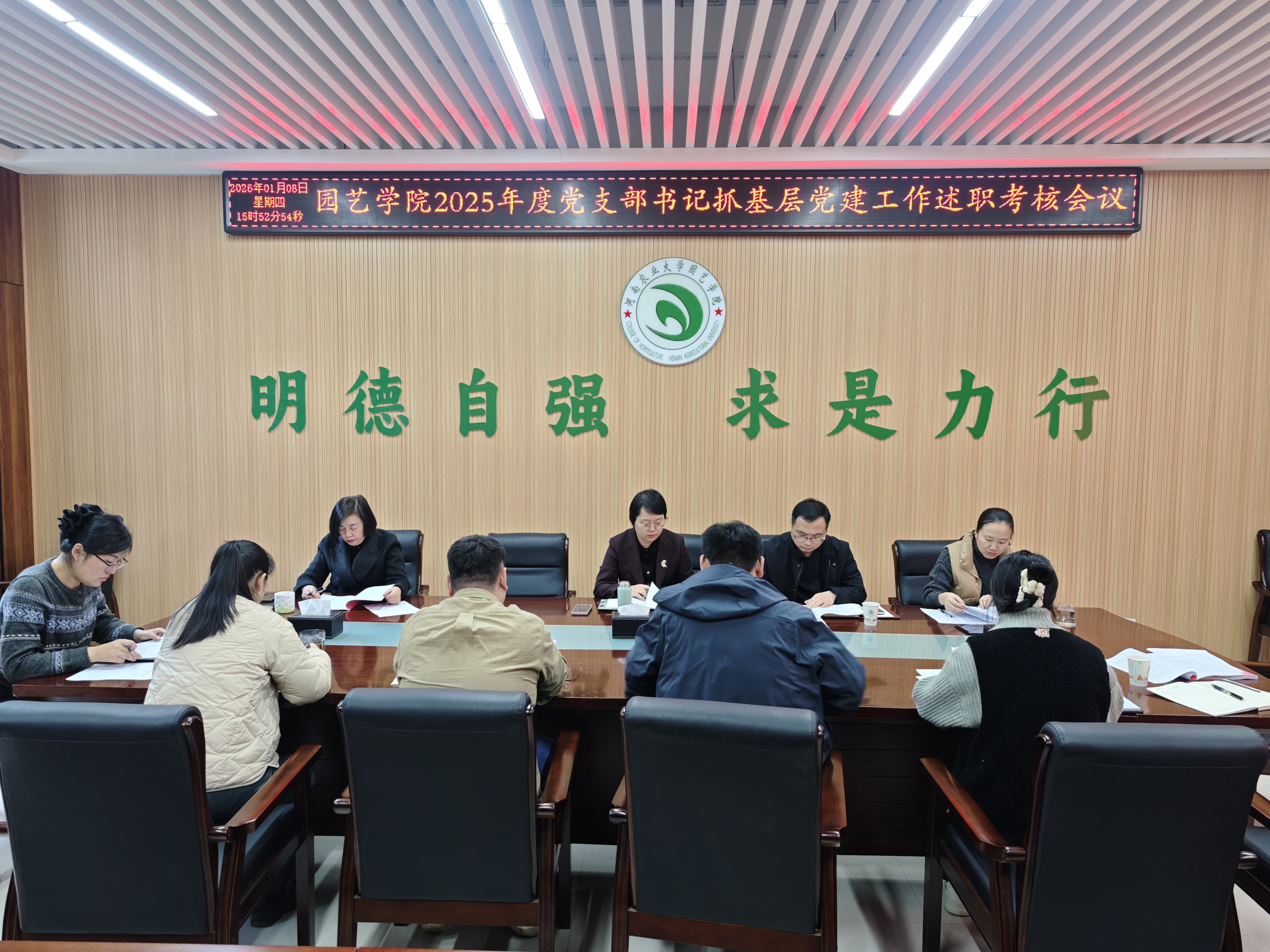 于力行楼北215会议室召开2025年度党支部书记抓基层党建工作述职评议考核会。学院党委书记郭娟主持会议,学院领导班子成员和各教工党支部书记参加会议。