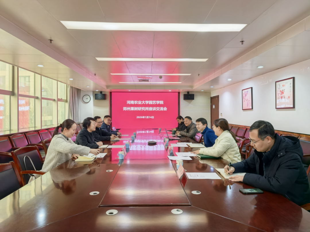 1月14日,学院党委书记郭娟、院长胡建斌一行赴中国农业科学院郑州果树研究所开展调研交流,副院长谭彬及果树系主任焦健等陪同参加。中国农业科学院郑州果树研究所所长曹珂研究员、科研处副处长徐倩倩、综合管理处副处长杨发向等人出席座谈会。