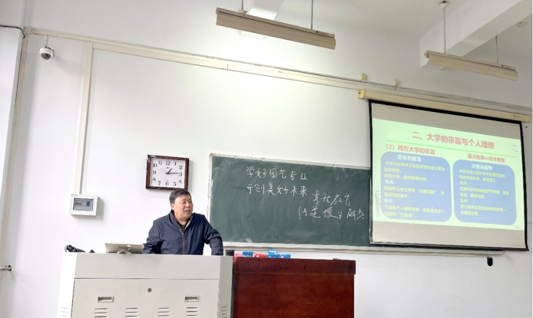 于桃西楼201教室开展第四十二期“教授导航”专题活动。本次活动以“学好园艺专业,开创美好未来”为主题,特邀学院荣休老师王吉庆教授担任主讲,班主任田中欢主持。