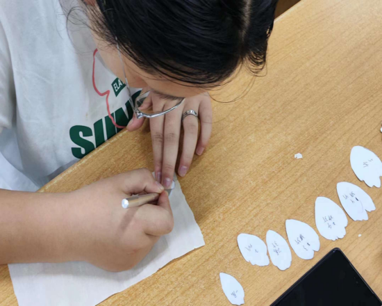 通草花,作为一项古老的非遗技艺,承载着历史的记忆和文化的传承。活动现场,气氛热烈而有序。同学们怀着对传统文化的敬畏与好奇,齐聚一堂。花语协会会长耿梦怡为大家详细介绍了通草花的历史渊源、制作工艺以及其独特的艺术价值。通过讲解,大家纷纷动手制作属于自己的通草花作品。同学们全神贯注,用灵巧的双手将一片片通草变成了一朵朵栩栩如生的花朵。有的制作出娇艳欲滴的玫瑰,有的打造出清新淡雅的百合,每一朵花都仿佛在诉说着对祖国的祝福。