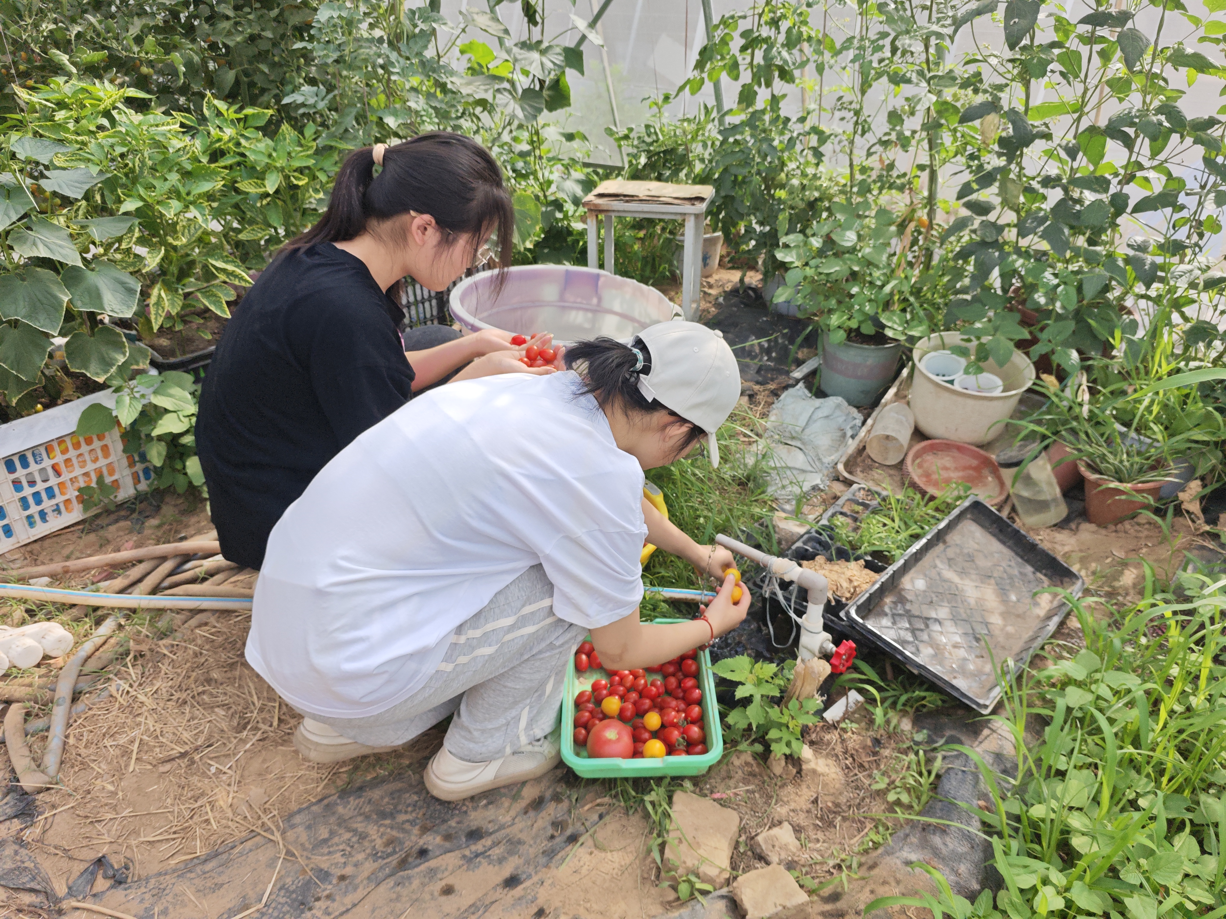 随后,同学们在老师的指导下进行了分组,明确了各组的实践任务。在领取了劳动工具后,分批次的投入到劳动,进入大棚开始除草、清理杂物并重新铺上了地膜,通过两个小时的劳作,大棚的面貌焕然一新,为下一步秋栽做好了准备工作。劳动结束后,大家在王永带领下一起学习了基地里不同蔬菜的栽培种植方法,大家近距离的观察了种植的西瓜、西红柿、黄瓜、豆角、生菜、油麦菜等应季蔬菜的生长情况,并体验了瓜果成熟采摘果实的劳动乐趣。