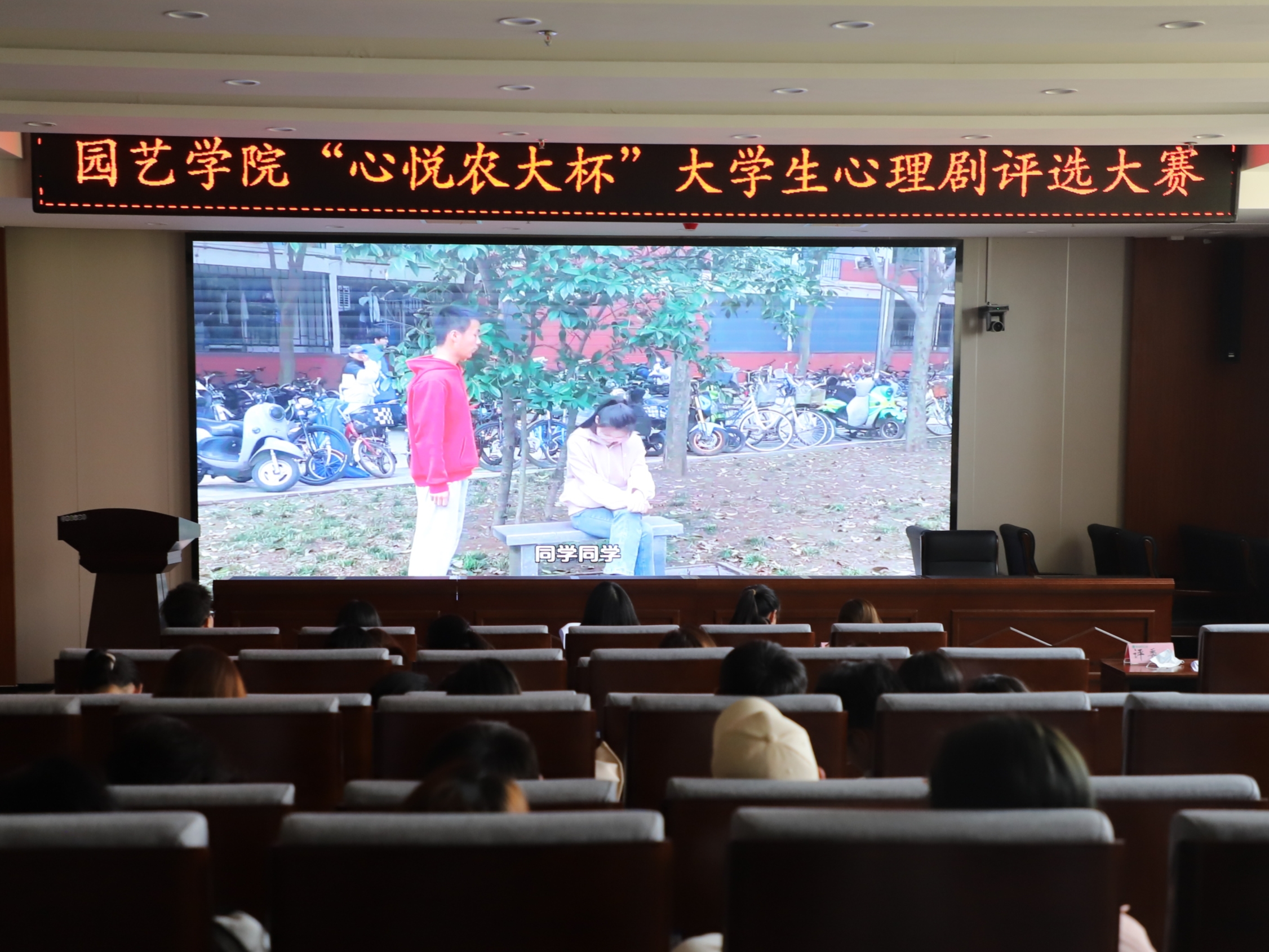 于龙子湖校区力行楼北209会议室开展“心悦农大杯”大学生心理剧评选大赛,2022级辅导员乔芳芳和2022级学生代表刘云、刘瑶瑶、赵双双、李禄裕、马永甜、王博政担任评委,2022级和2023级学生踊跃报名现场观赛。