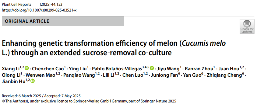 近日,河南农业大瓜类分子育种团队在Plant Cell Reports发表了题为“Enhancing genetic transformation efficiency of melon (Cucumis melo. L) through an extended sucrose-removal co-culture”的研究论文。该研究通过优化根癌农杆菌介导的甜瓜遗传转化体系,显著提高了转化效率,并利用优化后的体系成功创制了无卷须甜瓜新种质,为甜瓜基因功能研究和遗传育种提供了有力工具。