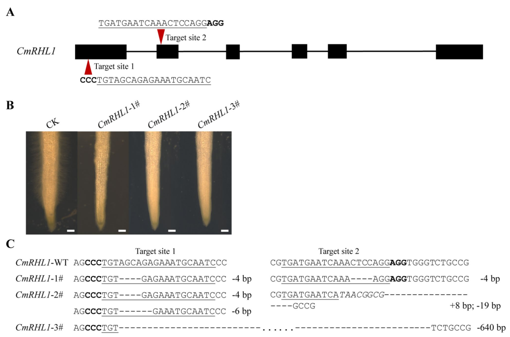 完全编辑、部分编辑、无编辑等三种类型。最后团队利用该体系对甜瓜CmRHL1基因进行敲除,发现该基因被敲除后甜瓜的根毛不能形成。