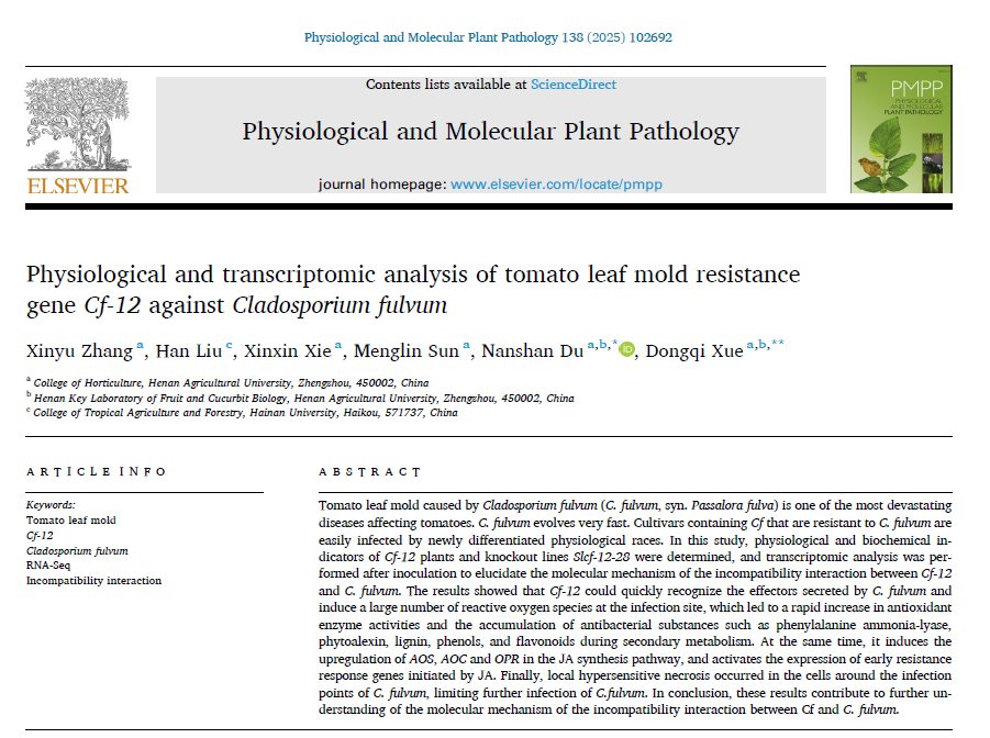 近日,轻小说 茄科抗病抗逆种质创新研究团队在园艺学领域期刊《Physiological and Molecular Plant Pathology》发表了题为“Physiological and transcriptomic analysis of tomato leaf mold resistance gene Cf-12 against Cladosporium fulvum” 的研究论文。研究对Cf-12及其敲除植株Slcf-12-28 在抗性生理、生化及转录水平上的差异进行了表征,研究结果丰富了Cfs基因响应叶霉病侵染的抗性生理。