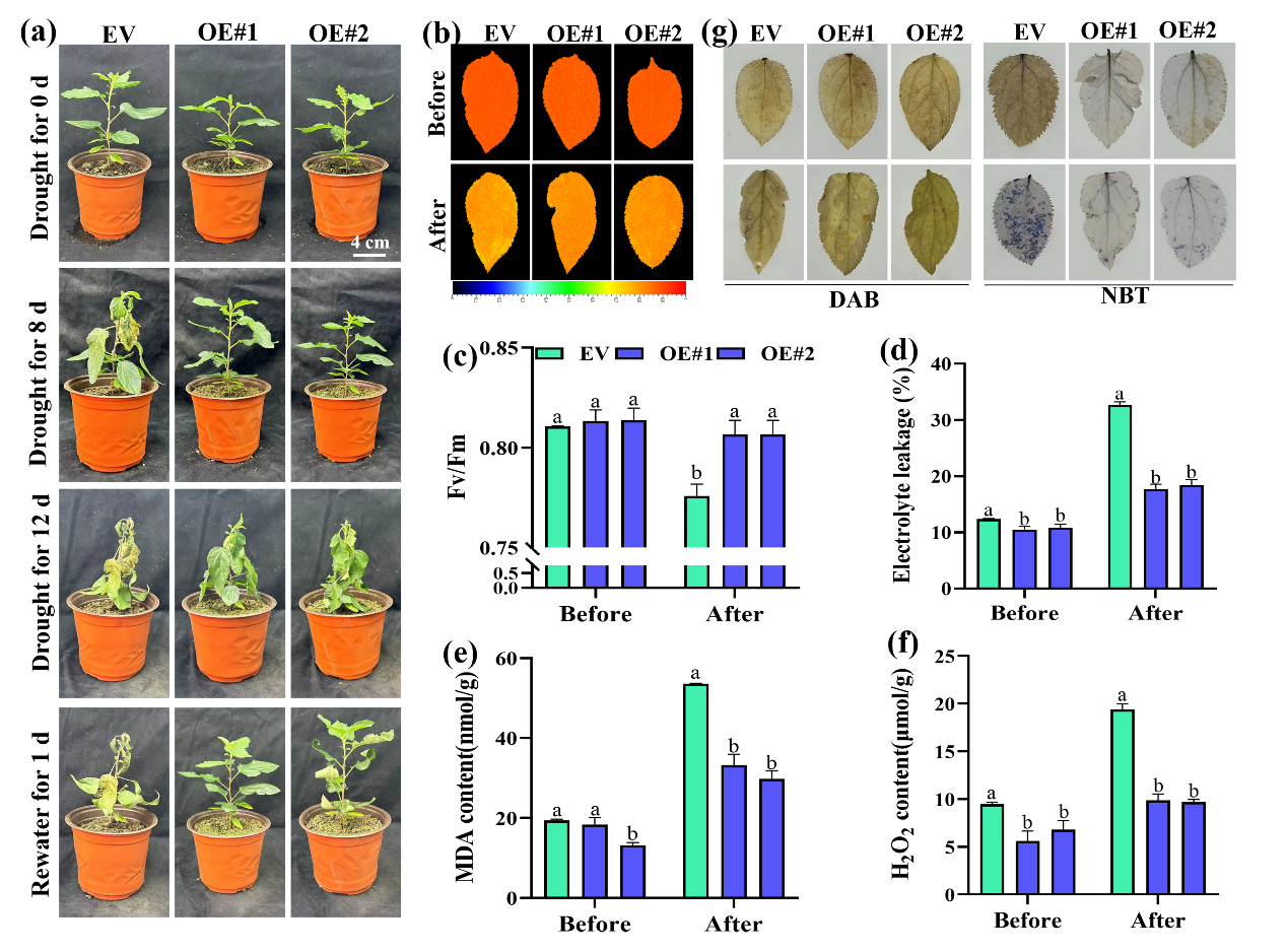 该研究从野生苹果种质资源平邑甜茶中鉴定出一种NF-Y转录因子MhNF-YA3-like。基因表达分析显示,MhNF-YA3-like的表达水平在干旱和ABA处理下均显著上调。研究人员构建了MhNF-YA3-like的RNAi基因干扰株系和过表达株系,处理发现MhNF-YA3-like在苹果耐旱性中起正调控作用(Fig.1)。