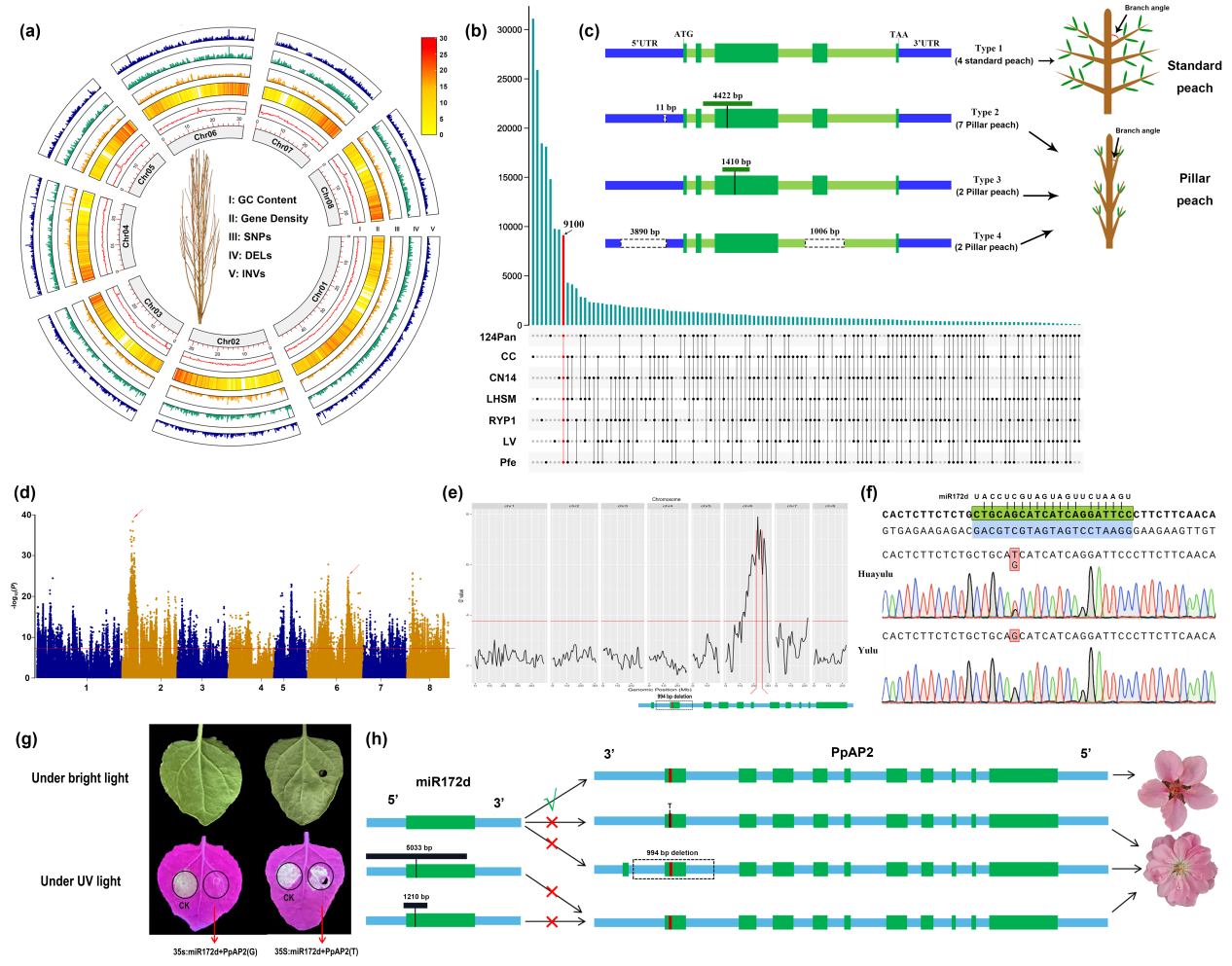 1346)(图1g)。至此,我们发现miR172d和PpAp2共同决定桃单/重瓣花性状的形成。当miR172d和PpAp2均正常时,miR172d可靶向降解PpAP2,形成单瓣花。当miR172d或其在PpAP2上的结合位点出现变异,导致miR172d无法降解PpAP2,而形成重瓣花(图1d-h)。