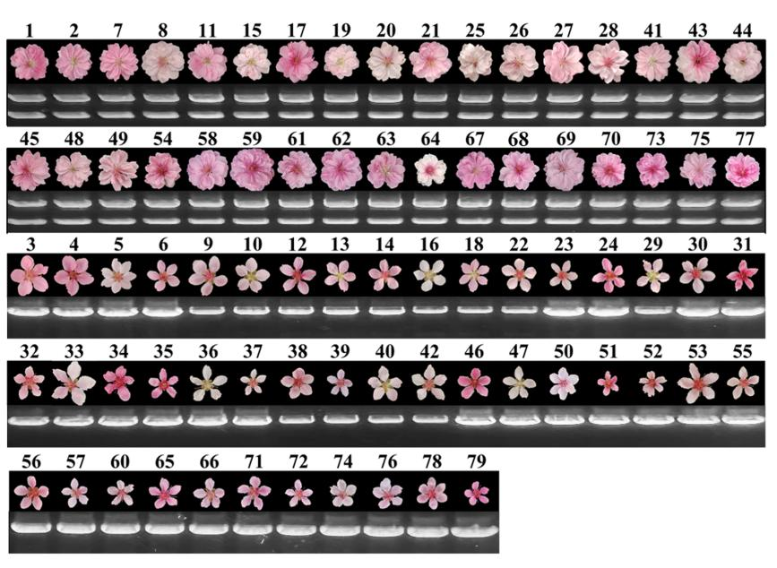 重瓣花观赏价值高,为探究桃花单/重瓣性状形成的分子机理,利用自然群体GWAS发现单重瓣花性状定位于1号染色体,结合比较基因组发现重瓣花‘照手红’中miR172d存在长片段插入,以插入片段设计分子标记,发现32个重瓣花资源中27个符合,5个材料(‘No.18’, ‘HongChuizhi’, ‘1-1-4’, ‘1-2-7’ and ‘Huayulu’)不符合。