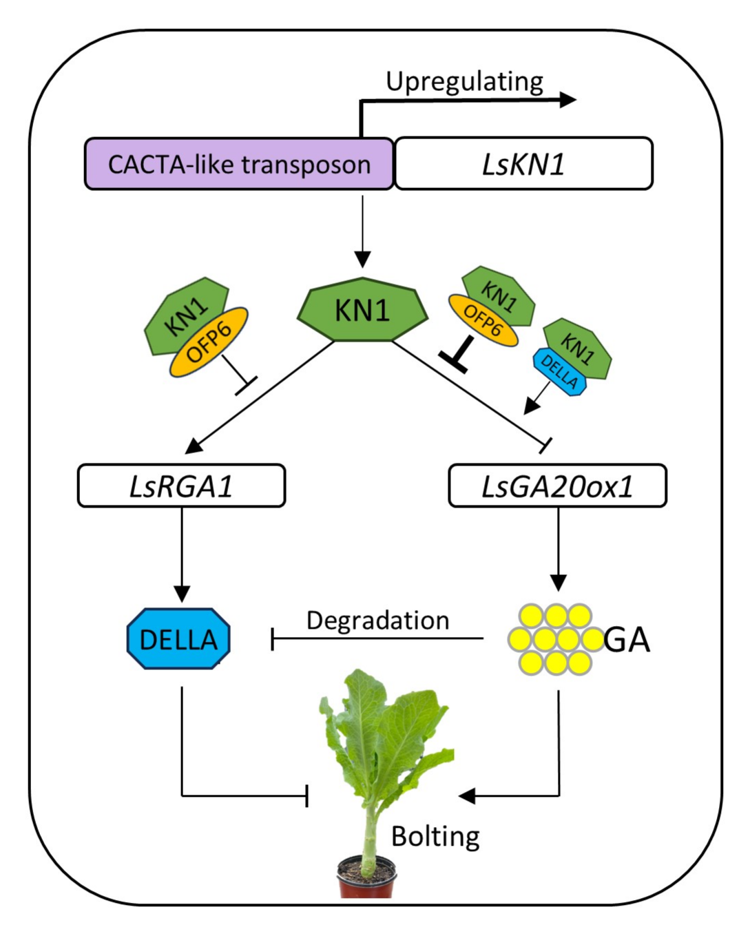 TP转录因子直接结合在赤霉素合成基因LsGA20ox1以及赤霉素响应基因LsRGA1的启动子上,并分别下调和上调LsGA20ox1和LsRGA1基因。有趣的是,LsRGA1编码的DELLA蛋白与LsKN1