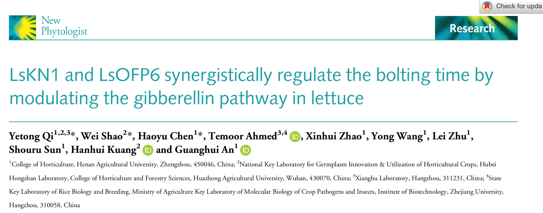 安光辉教授团队在莴苣抽薹机制研究及耐抽薹莴苣种质创制方面取得了重要进展。相关研究成果以“LsKN1 and LsOFP6 synergistically regulate the bolting time by modulating the gibberellin pathway in lettuce”为题,发表在国际著名学术期刊New Phytologist(中科院一区Top期刊)。该论文通过正向遗传学成功定位克隆了莴苣抽薹主效基因LsKN1,揭示了LsKN1和LsOFP6协同调控内源赤霉素的合成和响应,进而调控莴苣抽薹的遗传和分子机制。