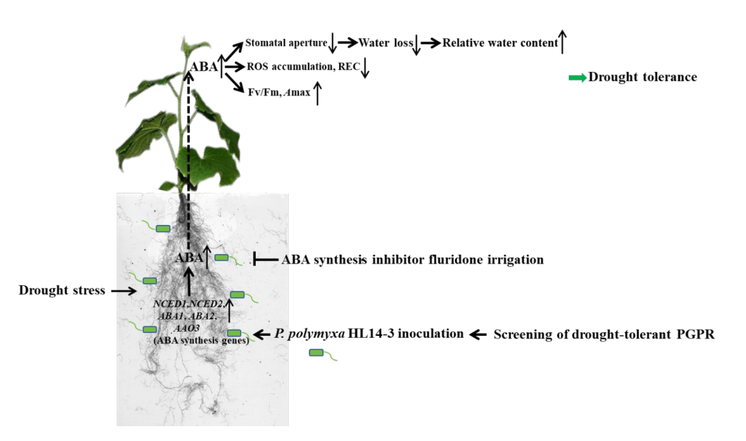 Paenibacillus polymyxa HQ1-2,共9个菌株,通过检测正常和干旱胁迫条件下接种不同菌株的黄瓜植株生长表型、叶片相对电导率(REC)及光系统Ⅱ最大光化学效率(Fv/Fm),发现多粘类芽孢杆菌HL14-3表现出高耐旱潜力,表现为与对照和其他促生菌接种处理相比,HL14-3处理的植株萎蔫程度最低,REC值最小、Fv/Fm值最大。接种HL14-3可以提高干旱胁迫下黄瓜幼苗的存活率,HL14-3在聚乙二醇(PEG)模拟的干旱胁迫下能稳定生长,并且在正常和干旱条件下均能在黄瓜根部有效定殖。进一步研究表明,HL14-3菌株可以显著缓解干旱胁迫导致的生长抑制和氧化损伤,提高根系活力,改善根系构型。此外,接种 HL14-3促进黄瓜叶片气孔关闭,减少了水分损失,增加了相对含水量。重要的是,HL14-3菌株可以显著提高干旱胁迫下黄瓜叶片和根部ABA含量、促进黄瓜根系ABA合成基因