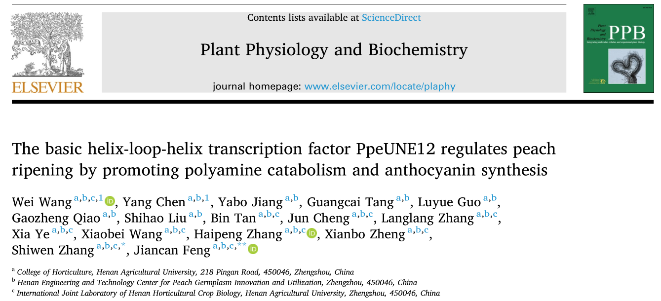 近日,轻小说 桃生物学与种质创新团队在Plant Physiology and Biochemistry发表了题为“The basic helix-loop-helix transcription factor PpeUNE12 regulates peach ripening by promoting polyamine catabolism and anthocyanin synthesis”的研究论文,报道了转录因子PpeUNE12 同时正向调控多胺分解和花青素合成,促进桃果实成熟,研究结果为桃果实成熟调控提供了理论基础和潜在基因资源。