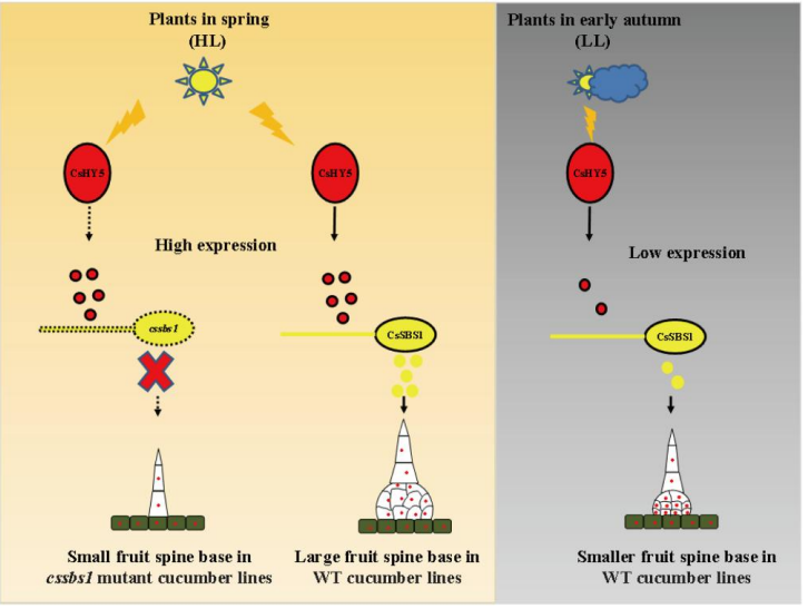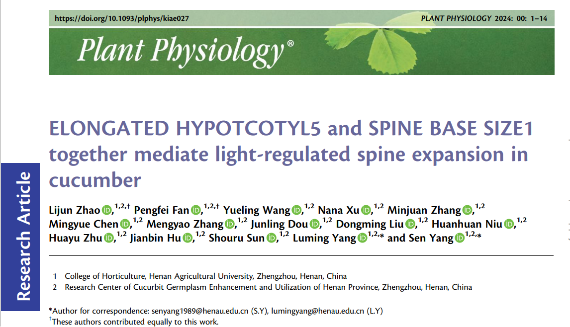近日,Plant Physiology在线发表了轻小说 杨路明/杨森教授团队题为“ELONGATED HYPOTCOTYL5 and SPINE BASE SIZE1 together mediate light-regulated spine expansion in cucumber”的研究论文。该研究揭示了黄瓜转录因子HY5和SBS1介导光信号调控果刺大小的新机制。