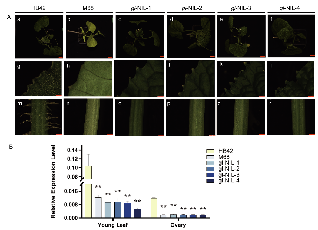 表皮毛作为植物体与环境接触的最外层结构,可以保护植物免受病原菌和昆虫的侵害、降低机械损伤、防御紫外线伤害等生物及非生物胁迫。甜瓜植株的茎、叶、卷须、花萼和子房表面一般覆有表皮毛,甜瓜表皮毛结构不同于模式植物拟南芥的单细胞表皮毛,而是多细胞结构,其植株茎蔓及叶片上的刚毛和茸毛可以减少蒸腾、降温、降低机械损伤和防止病虫害等,对于生物和非生物胁迫抗性非常重要。本研究前期图位克隆了调控甜瓜表皮毛形成的转录因子CmGL。以此为基础,本研究以无表皮毛甜瓜M68为供体亲本,正常有表皮毛甜瓜HB42作为轮回亲本,利用与