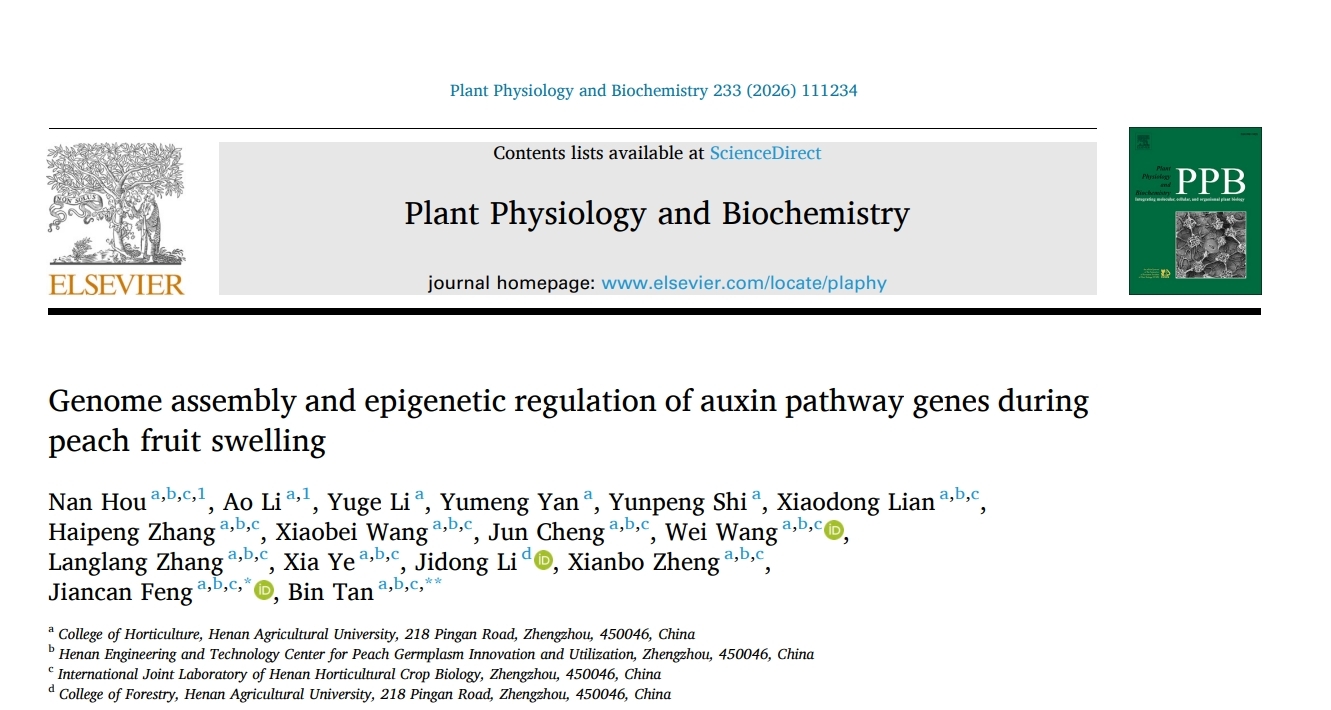 桃生物学与种质创新团队在Plant Physiology and Biochemistry杂志在线发表了题为“Genome assembly and epigenetic regulation of auxin pathway genes during peach fruit swelling”的研究论文,揭示了DNA甲基化通过调控生长素代谢基因参与果实膨大的表观遗传机制,为培育高产优质桃新品种奠定了理论基础。